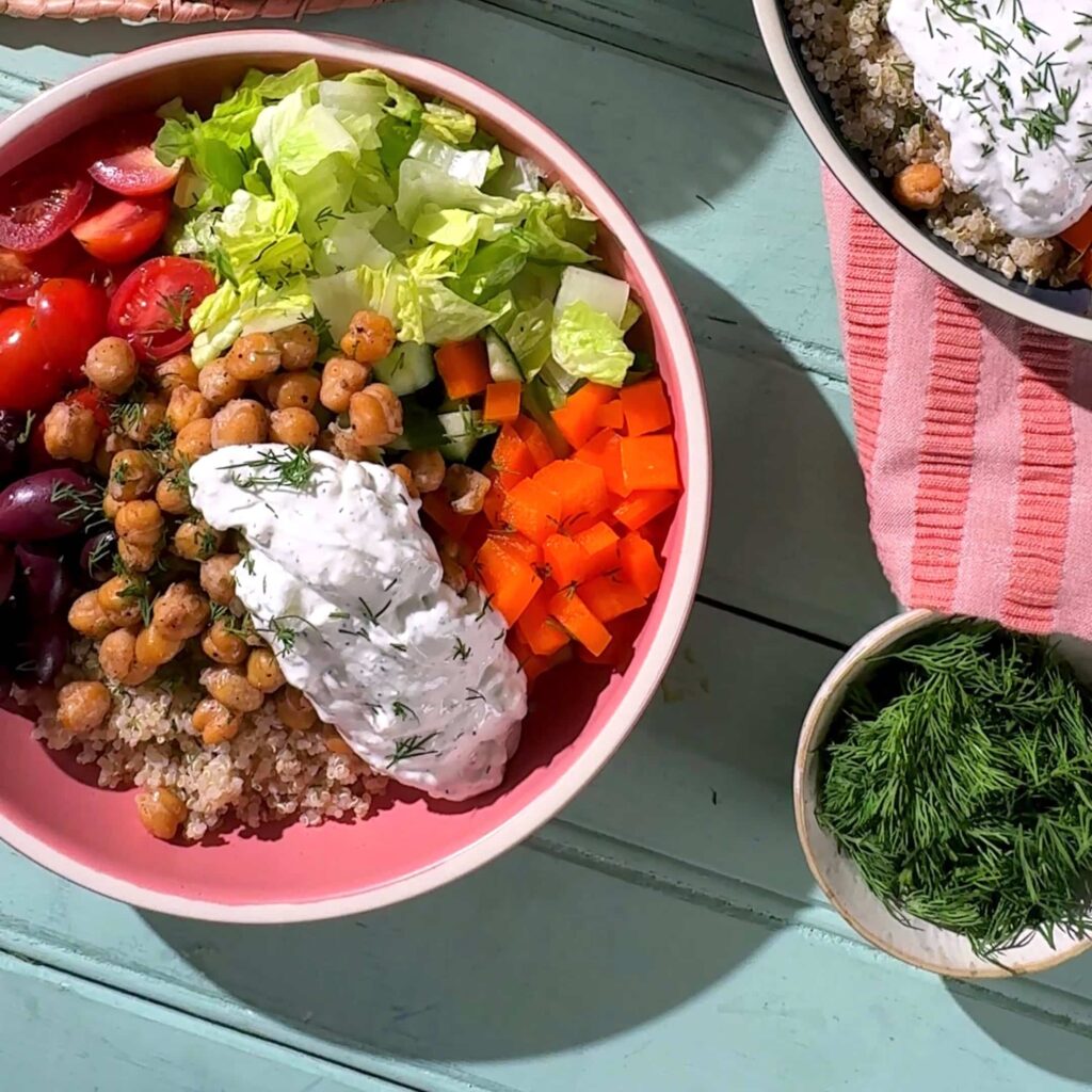 These Mediterranean-Style Buddha Bowls made with Good Foods Feta Cucumber Dip are your next favorite dinner recipe!